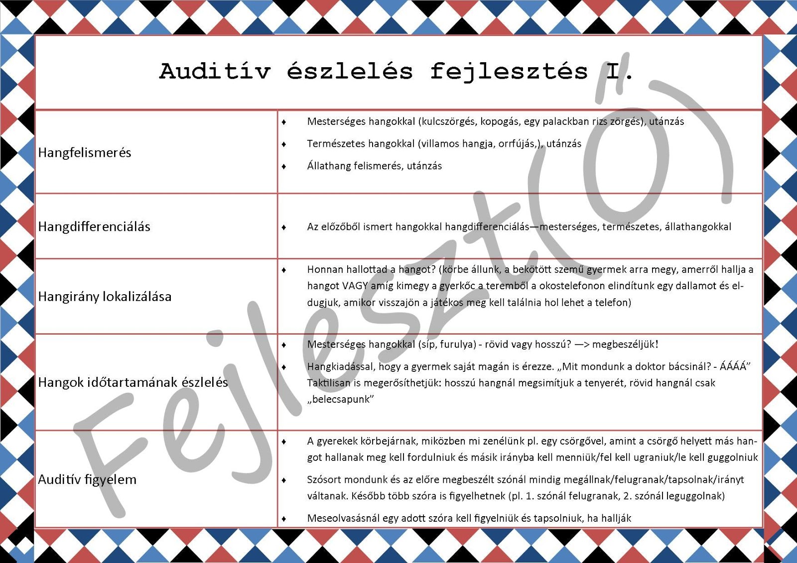 A Grafomotoros fejlesztés című bejegyzésem sokaknak tetszett. Kérés volt, hogy más területekre is készítsek hasonló jellegű összefoglaló táblázatot, íme az auditív területhez. Az első az alapok fejlesztéséhez készült, a második táblázat feladatait, nagycsoportban érdemes a gyermekekkel csinálni.